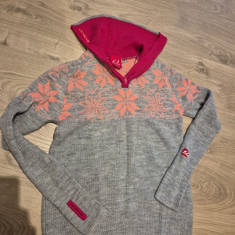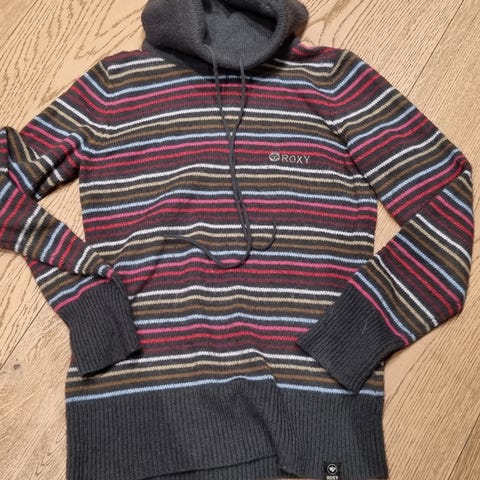 Kjempefin og myk hettegenser med koselig mønster på lomme og i hette. Lite brukt, men er litt nupper. Står XL på lappen, men vil si den er mer L. Kommer an på hvordan man vil den skal sitte.