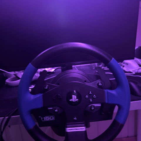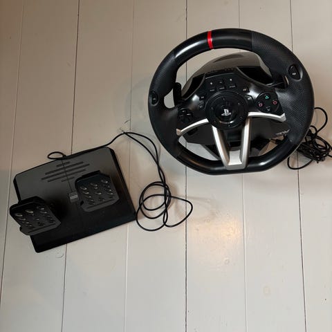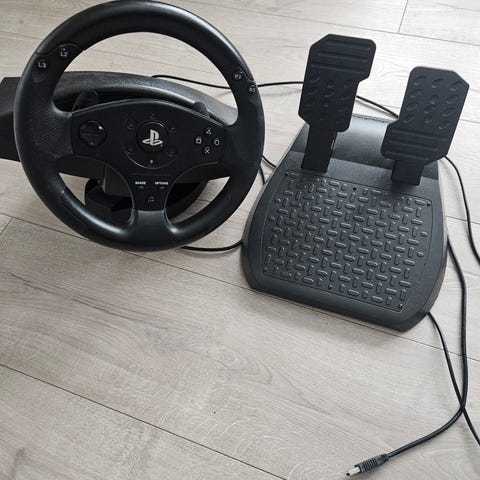 Thrustmaster racerratt med pedaler for PlayStation 3 og PlayStation 4. Settet består av ratt med innebygde PlayStation-knapper og indikatorlys, samt pedalsett med gass- og bremsepedal. Rattet har bryter for valg mellom PS3- og PS4-modus. Farge svart. Egnet for bilspill på kompatible PlayStation-konsoller.