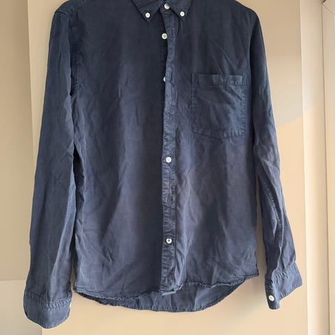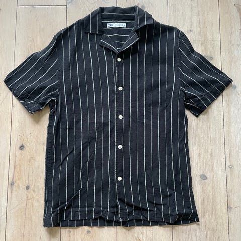 Zara skjorte for herre i størrelse S. Skjorten er blå og laget av bomull. Modellen har relaxed fit, lange ermer og klassisk krage. Fronten har knappelukking og to brystlommer med klaff. Passer til hverdagsbruk og kan brukes både åpen over t‑skjorte eller lukket som vanlig skjorte.