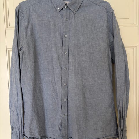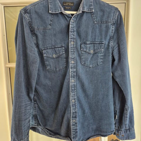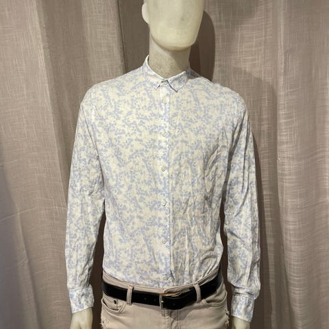 Zara skjorte for herre i størrelse M. Skjorten er laget av bomull og har et blått bladmønstret trykk på lys bunn. Langermet modell med krage og knepping foran. Egnet til hverdagsbruk eller mer pyntede anledninger, og kan brukes alene eller under genser eller jakke.
