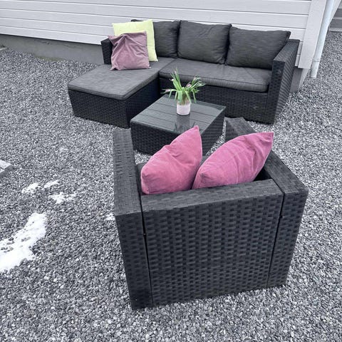 Hjørnesofa utemøbelsett med bord i grå kunstrotting. Settet består av en hjørnesofa med flere sittemoduler og løse rygg- og seteputer i grått tekstil, samt et rektangulært bord med glassplate. Trekk på puter kan tas av og vaskes.