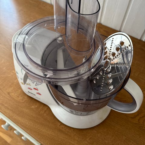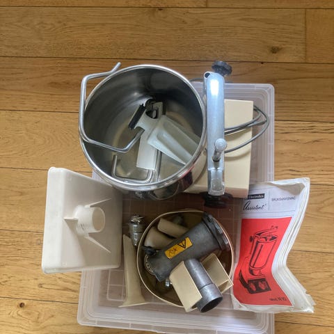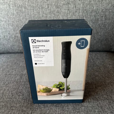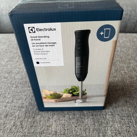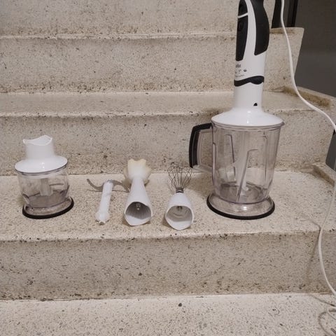 Settet inneholder en elektrisk suppemikser, visp, hakker med beholder og lokk, samt en høy miksekanne. Stavmikseren mangler