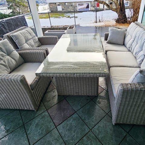 Finen hagemøbler i god stand selges billig pga flytting. Medfølger puter til hele sittegruppen. En av de enkle stolene er skjev, men fungerer som den skal.