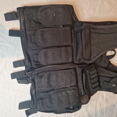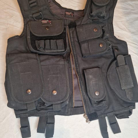 Pent brukt taktisk stridsvest fra Strike Systems. Det er et lite hull ved logoen som vist på bildet, ellers hel og pen. Det er flere magasinlommer samt integrert pistolholster og utstyrslommer. Vesten er utstyrt med Velcro og D-ringer. På ryggen er det en større lomme til oppbevaring. Universal størrelse, gode justeringsmuligheter.
