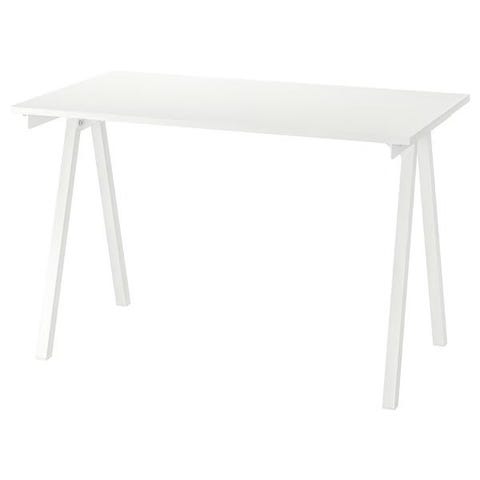 Selger et hvitt skrivebord fra IKEA (ca. 120 × 80 cm). Solid og stabil konstruksjon med slitesterk melamin overflate som er enkel å rengjøre. Justerbare ben slik at høyden kan tilpasses. Praktisk løsning for kabelføring under bordplaten.