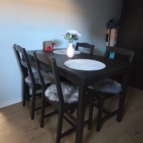 Barstoler og bord i eik. Mørk brunt.
