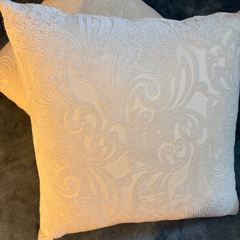 IKEA pynteputer i hvit farge med dekorativt brodert bånd på forsiden og små dusker langs kanten. Putene passer til bruk i sofa, stol eller på seng som ekstra støtte eller som dekorasjon i stuen eller soverommet. Stoffet fremstår som glatt og ensfarget, med et teksturert bånd som gir et mer detaljert uttrykk. Egnet for innendørs bruk.
