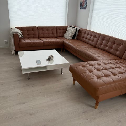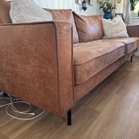 Solid skinnsofa med sjeselong, ca 4 år gammel