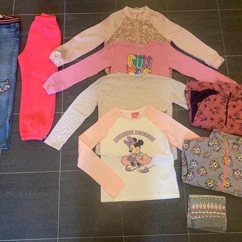 Klespakke til jente 128. Kjoler, gensere, t-skjorter, bukser, stillongser, shorts og vest. Kunne ikke se noe hull eller skader på noen av klærne.