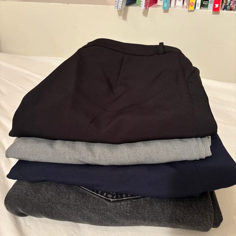 Damebukser i størrelse S/36 i ulike farger og modeller. Pakken inneholder flere bukser, blant annet svarte, grå, beige og stripete varianter. Buksene har forskjellige snitt, fra vide til mer figurnære modeller, og noen har lommer og stramming i livet. Egnet til hverdagsbruk og fritid. Ingen spesifikk merking av materiale eller merke oppgitt.