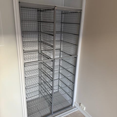 Elfa trådkurvstativ i hvitlakkert metall. Stativet har flere uttrekkbare trådkurver i ulike høyder, egnet til oppbevaring av klær, tekstiler eller annet utstyr. Passer for bruk i garderobe, bod eller andre rom der det er behov for å organisere og strukturere oppbevaring. Stativet er frittstående og kan kombineres med annet Elfa-utstyr i samme system.