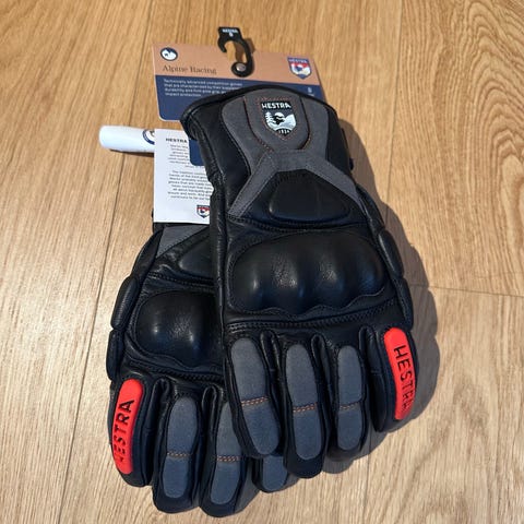 Helt nye Hestra racing hansker, str 8. Modellen er RSL Comp Vertical Cut. Følger med en liten tube med Hestra Leather balm. Ytre materiale er skinn, og indre er en slags fleece, de har padding så passer bra til alpin racing. Nypris 2200 kr