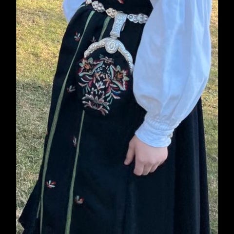 Alt sølv, skjorte, lue, underskjørt og veske medfølger.