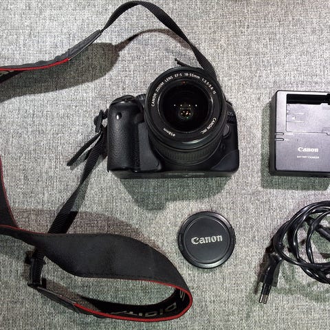 Digitalkamera i EOS-serien fra Canon. Kameraet har utskiftbar objektivfatning (Canon RF-bajonett) og er egnet for både foto og video. På bildene følger det med kamerahus, standardzoomobjektiv, objektivdeksel, skulderrem, batterilader med strømkabel og brukerveiledning.