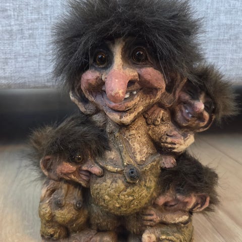 Trollfigur - troll med to hoder. Høyde ca 26 cm. Litt slitasje på nesen til det ene hodet + noen små andre merker, se bilder.