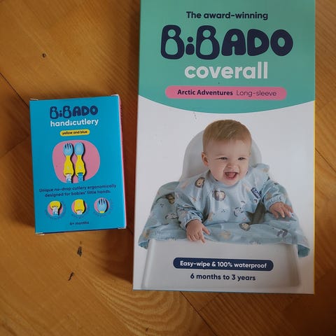 Bibado Coverall Weaning Bib (ny versjon). En helt ny og ubrukt smekke med ermer i den rosa varianten "Botanical Garden" fra det velkjente britiske merket Bibado. Smekken dekker overkropp og armer, men det som gjør den spesiell er at den også har forlengelse som kan festes til matstolen for å beskytte både klær og stol under måltidene.