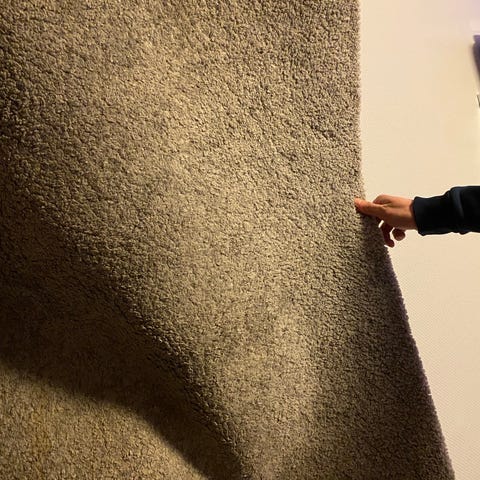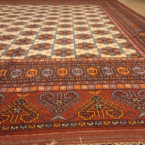 IKEA teppe med geometrisk mønster i flere farger, blant annet blåtoner, grått, hvitt og rust/oransje. Rektangulær form med frynser langs kortsidene. Passer som gulvteppe i stue, soverom eller andre oppholdsrom. Teppeflaten har flatvevd struktur som gjør det enkelt å plassere under møbler og lett å holde rent ved støvsuging.