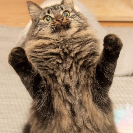 Jeg har også et spesialtriks hvor jeg stiller meg på bakbeina og nærmest hopper for å kose så høyt oppe på leggen som overhode mulig. Det bruker jeg hele tiden, spesielt når jeg er sulten. I det siste har jeg også begynt å sove i senga om natta, så hvis du synes det høres koselig ut så er det bare å adoptere meg så fort som mulig!