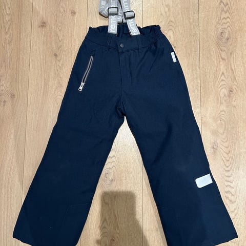 Praktisk svart vinterbukse, med mange lommer, stramming i livet, lufte glidelås på innsiden lår, glidelås nederst på beina, og avtagbar seler, med glidelås. Buksen har noen små skader nederst på ene beinet, selges derfor veldig billig.