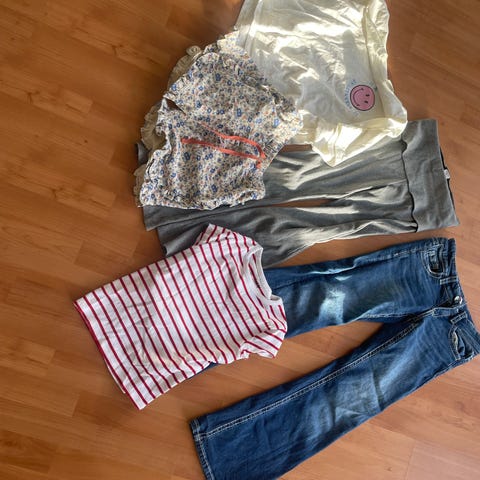 Jente klær i størrelse 146 i flerfargede varianter. Pakken inneholder ulike plagg som jakker, gensere, bukser og overdeler, egnet for jente i ca. størrelse 146. Klærne har forskjellige farger og materialer, og kan brukes til både hverdags og fritid avhengig av kombinasjon og behov.