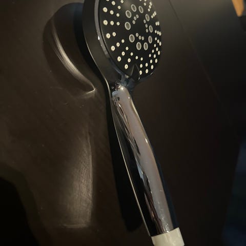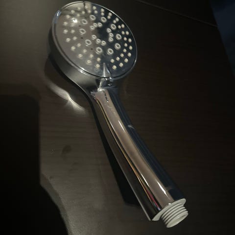 Rundt dusjhode i kromfarge med lys grå front. Standard gjenger for tilkobling til dusjslange. Passer til vanlig bruk i dusj og kan monteres på eksisterende dusjsystem der gjenger og tilkobling er kompatible.