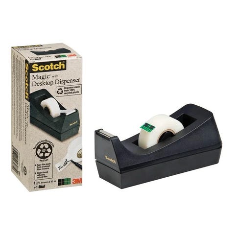 Stor tapedispenser fra Scotch C10 for tape/disktape. Tung modell som står stødig, kan ta tape med én hånd. Kan brukes både med vanlig tape og stor tape (har dobbel kjerne).