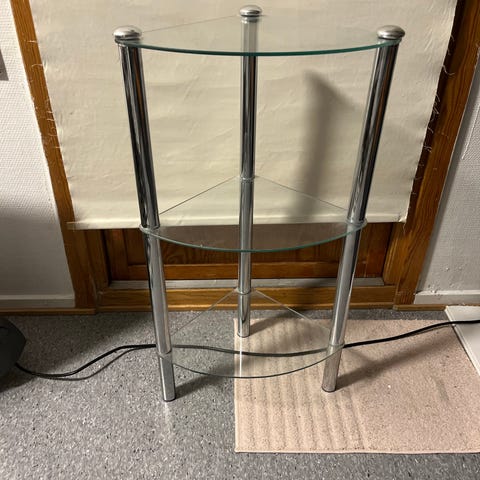 Hylle med glassplater og metallstativ