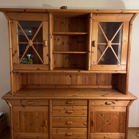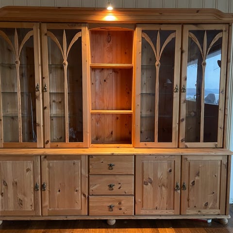 Pent brukt vitrineskap med skuffeseksjon og glassdører selges. Må hentes på Tveit.