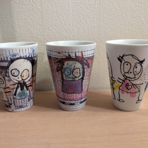 Krusene er uten hank og har det karakteristiske, lekne motivet med figurene og bysilhuett rundt hele koppen. Perfekt til kaffe, te eller som en del av en fargerik samling.