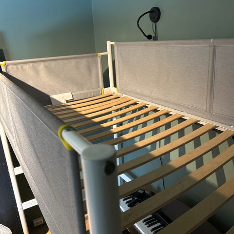 IKEA enkeltseng for barn. Sengen har ramme i metall med nettingpaneler langs sidene på overkøya for å gi beskyttelse mot fall. Underkøya har solid bunn i plater. Mørk farge på ramme og netting. Passer som barneseng på barnerom eller i gjesterom. Madrass følger ikke nødvendigvis med og må tilpasses standard enkeltseng-mål etter behov.uten madrasser