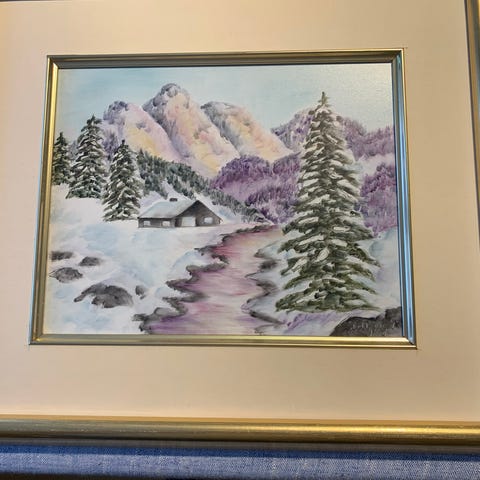 Gammelt bilde. Signert maleri vinterlandskap med hytte i ramme