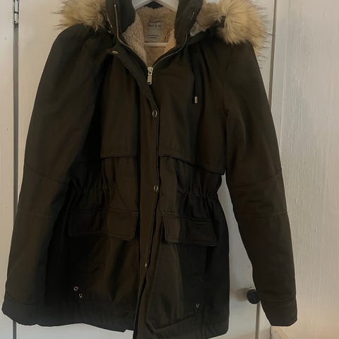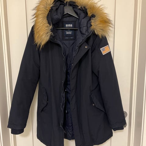 Svea vinterjakke for dame i størrelse M. Jakken er brun og har ytterstoff med bomull. Den har hette med avtagbar eller fast pelskant (syntetisk ukjent), knappelukking kombinert med glidelås foran og flere lommer i front. Patch-detalj på ermet. Egnet som ytterjakke i den kaldere årstiden.