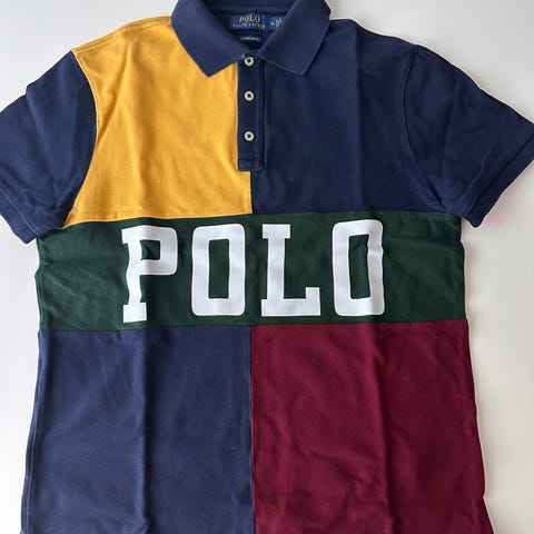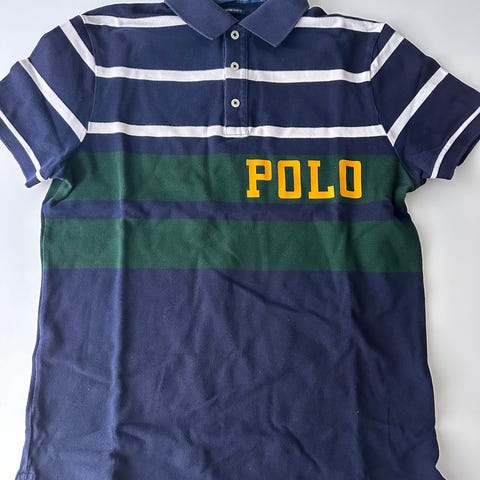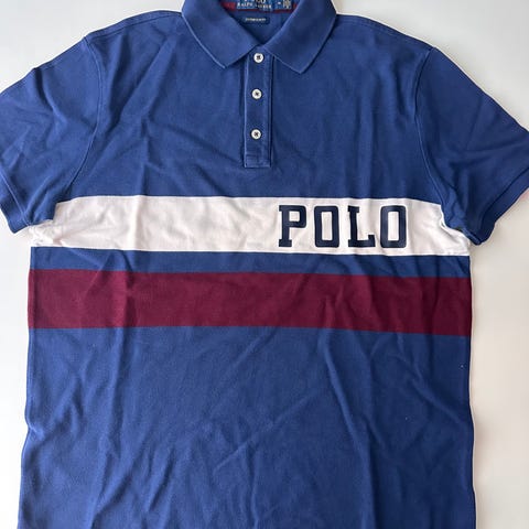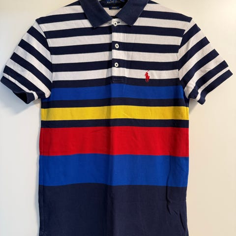Ralph Lauren Polo pique for menn i størrelse M. Piquen er laget i bomull og har krage med knappestolpe med tre knapper. Farge i ulike blåtoner med røde striper og stort gult «POLO»-trykk foran. Kortermet modell.