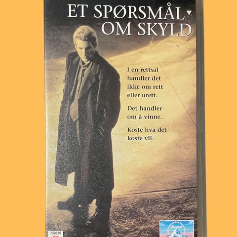 Norsk utgave av spillefilmen «Et spørsmål om skyld» på VHS-kassett. Kassetten leveres i original plastboks med norsk omslagstekst. Formatet er analog videokassett (VHS) beregnet for avspilling i standard VHS-spiller.