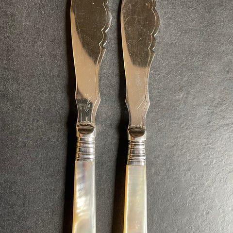 To perlemorskjeer med sølvskaft. Diameter 9 cm. Lengde 23 cm