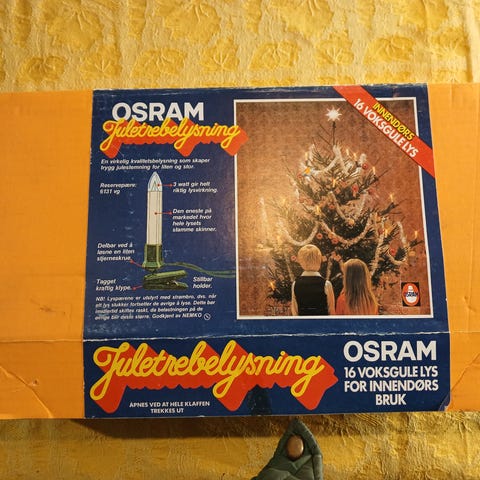 Original eske med vintage Osram juletrebelysning, et klassisk samlerobjekt for retro julepynt.