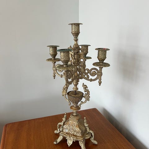 Selger en vintage 5-armet kandelaber i messing. Passer vanlige kronelys. Naturlig patina og bruksmerker kan forekommer. Mål: H24,5cm, B21,5cm.