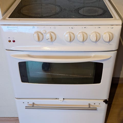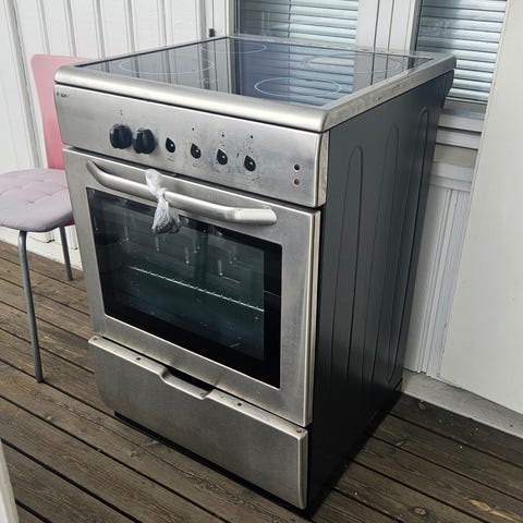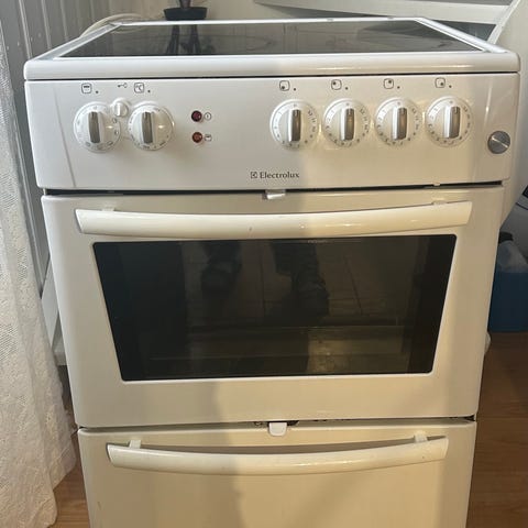 Eldre AEG keramisk komfyr i hvit utførelse gis bort mot henting. Komfyren har keramisk topp med flere kokesoner og frontplasserte brytere for betjening av både platetopp og stekeovn. Stekeovnen har glassdør med vindu for innsyn.
