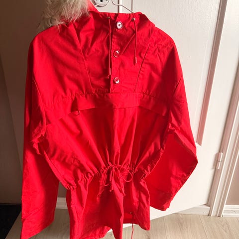 Fjellravn anorakk jakke i størrelse 42. Jakken er rød og har klassisk anorakkfasong med snøring i livet og nederst. Den har hette med snøring og glidelås øverst i front med rund glidelåstrekker. Fjellravn-logo på ermet. Passer til bruk som ytterjakke i hverdagen eller på tur.