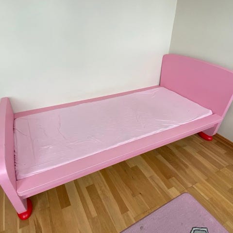 Juniorseng utformet som brannbil i rød farge. Sengen har sidepaneler med grå «rekkverk» som fungerer som sengehest på begge sider. Fronten er dekorert som fronten på en brannbil med vindu og lysdetaljer. Passer til barn som har vokst ut av sprinkelseng og over i juniorseng. Madrassmål er tilpasset standard juniorsengstørrelse (ca. 70x160 cm). Egnet som barneseng på barnerom.