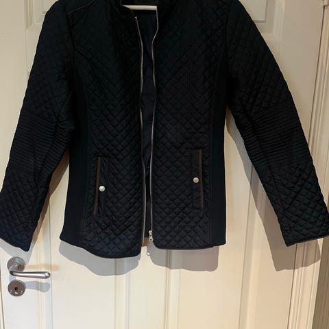 Freequent quiltet jakke for dame i størrelse S. Jakken er beige og har et rutemønstret, vattert yttermateriale. Den har lange ermer, høy krage og frontlukking med knapper. På fronten er det påsydde lommer med klaff. Jakken egner seg som lett ytterjakke i overgangssesonger eller milde dager.