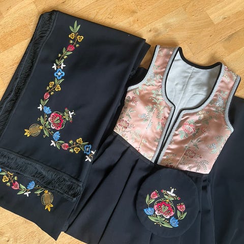 Har dessverre ikke forkle og sjalet, men kan få med veske,belte og sølvet for 16 000 kr.