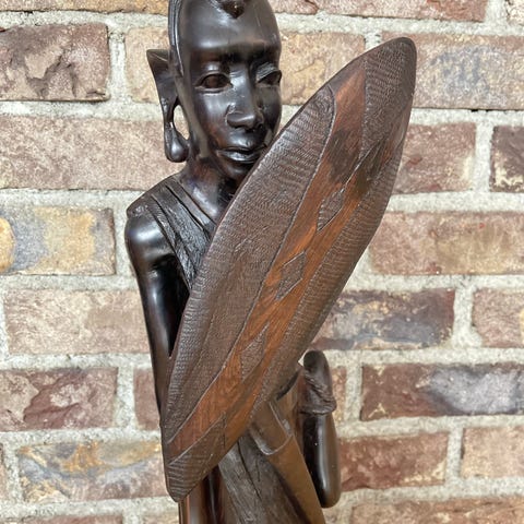 Håndskåret trefigur som forestiller en stående person med stav. Figuren er laget i mørkbeiset tre med utskårne detaljer i hår, ansikt, klær og tilbehør. Den står på en fast sokkel og er egnet som dekorativ gjenstand i stue, gang eller andre rom. Passer som innredningsdetalj på gulv eller i et større hyllesystem, og kan inngå i en samling av treskulpturer eller etnisk inspirert interiør.
