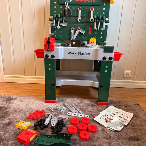 Hel og pen arbeidsbenk fra Bosch til barn med liksom sag som lager lyd.