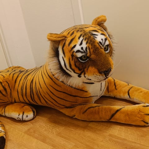 Pen tiger ryggsekk i plysj. Kjøpt i Dyreparken i Kristiansand. Ubrukt og myk og pen. 40 cm.