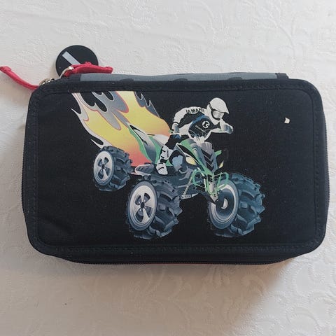 Penalhus med bilmotiv i blå og svarte toner. Penalhuset har flere glidelåser og rom, egnet for oppbevaring av penner, viskelær, linjal og annet skoleskrivesaker. Passer til skolebruk for barn.