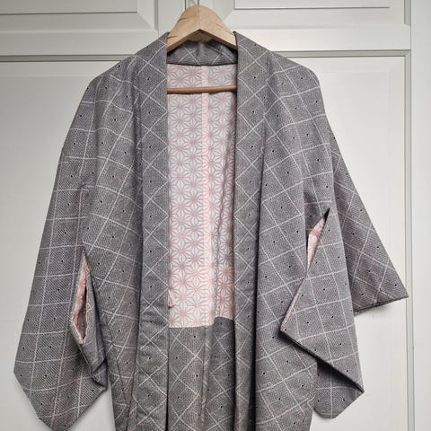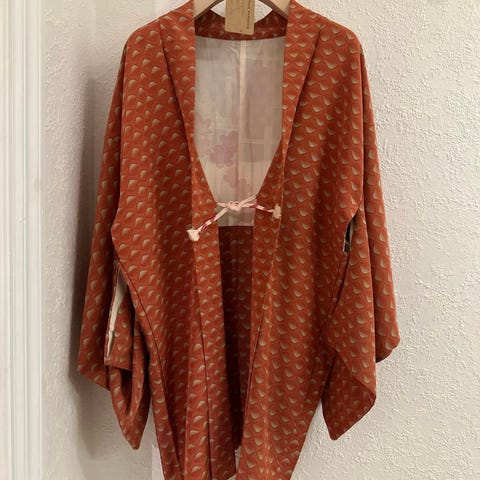 Original japansk Kimono i nydelig silkeblend med suse farger og original design. Rekker til midt på låret ca- vide armer. Like fin utenfor lin som jeans, yogapants eller kjoler. Solid håndverk