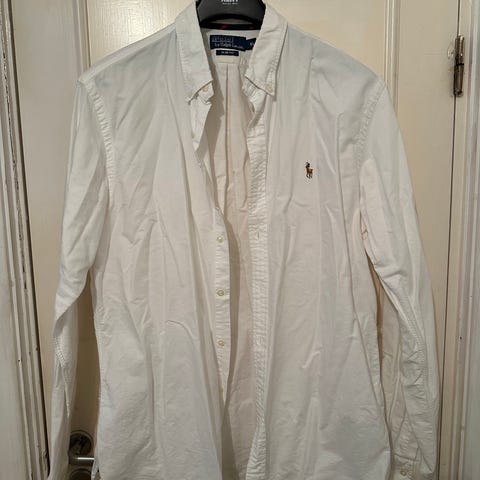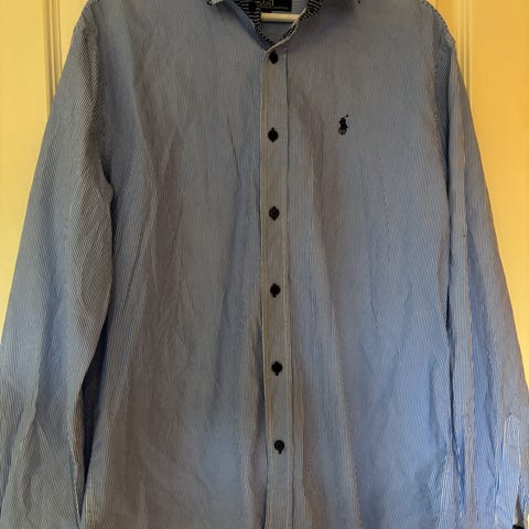 Ralph Lauren Polo skjorte for herre i størrelse XL. Skjorten er laget i denim og har blå farge. Klassisk modell med krage, knappestolpe i front og mansjetter med knapper. Brodert logo på brystet. Egnet som hverdags- og fritidsskjorte. Selges grunnet trenger mer plass i skapet.