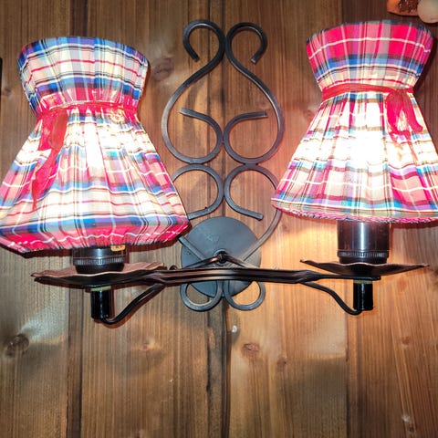Eldre, men velfungerende, vegglampe med to lyskilder/skjermer. Smijern med koselige smårutete skjermer. Klassisk hyttelampe. Lyspærer følger ikke med.