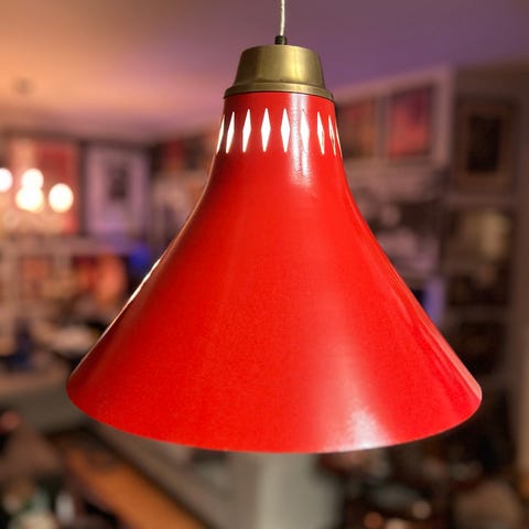 Skikkelig kul pendellampe i rød lakkert metall. Lampen har dråpeformet skjerm med hvit innside. Diameter er ca. 25cm, og høyden ca 28cm. Lampen er merket med maks 60 W og er produsert i Tyskland. Leveres med sort ledning og takoppheng, slik det vises på bildene. Veldig lite bruksmerker, i pen stand.